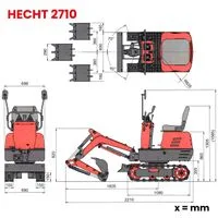 HECHT 2710 je kompaktan gusjenični mini bager namijenjen korisnicima koji trebaju pouzdan i učinkovit stroj za iskope oko kuće, u dvorištu, na okućnici ili na manjim gradilištima. Zahvaljujući malim dimenzijama i stabilnom gusjeničnom pogonu, idealan je za rad na mjestima gdje veliki strojevi nemaju pristup.